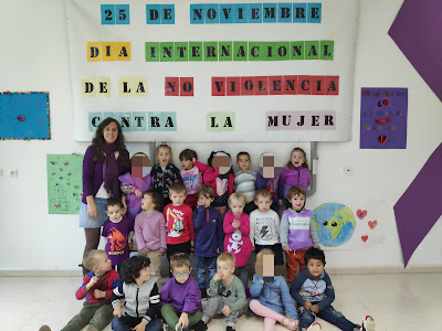 El 25 de noviembre celebramos en el cole el día internacional de la no violencia contra la mujer. Para ello, acudimos al cole vestidos con algo morado. En asamblea abordamos el tema al nivel de los niños/as de 3 años: rechazando la violencia y proponiendo alternativas para resolver los conflictos. Según ellos, hablar, decírselo a la seño, darse un abrazo, contar hasta 10... son algunos ejemplos que los niños/as expusieron.